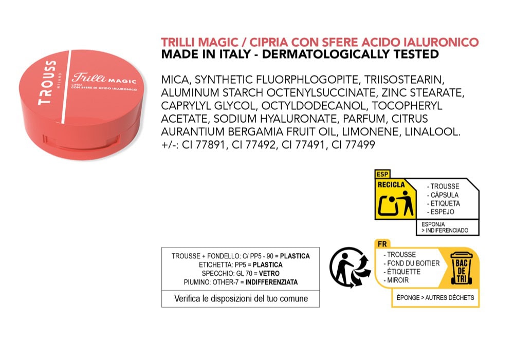 Scopri Trilli Magic, la cipria compatta e trasparente che sublima la tua pelle con un finish naturale e delicato. Questa cipria con acido ialuronico, dona un effetto levigante e idratante, adattandosi perfettamente a ogni incarnato.