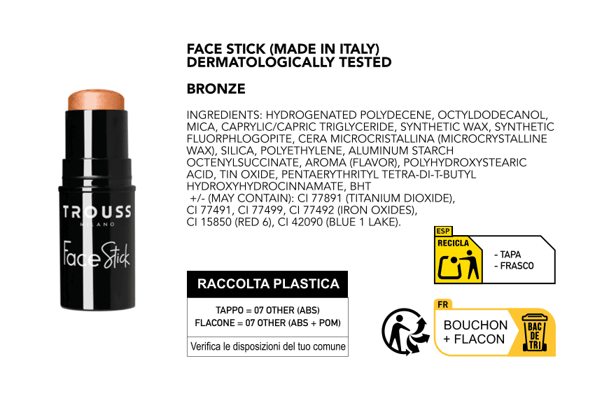 Trouss Milano ha un’identità Made in Italy: i nostro cosmetici sono prodotti in Italia. Ogni informazione è presente sul packaging, come da normative vigenti.