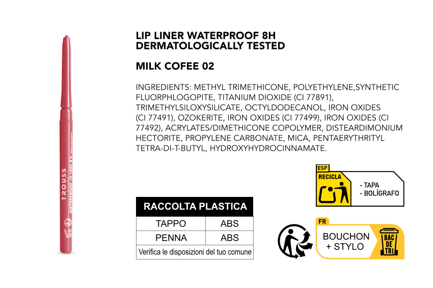La Matita Labbra Milk Coffee di Trouss Milano è la matita labbra long lasting dalla punta retrattile super pratica! La consistenza cremosa e la punta super scorrevole la rendono facile da utilizzare. La speciale formulazione la rende resistente all’acqua e anti-sbavature.