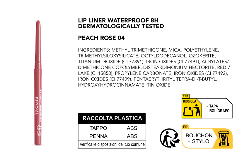La matita labbra waterproof Peach Rose di Trouss Milano è l’alleata perfetta per chi vuole un trucco resistente. La speciale formulazione la rende resistente all’acqua, e in più è anti-sbavatura.