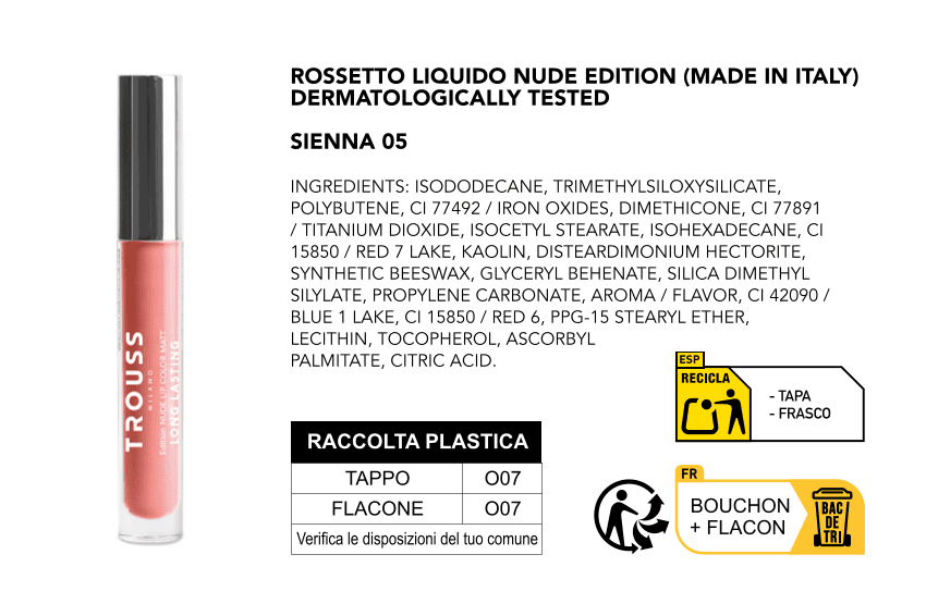 Trouss Milano ha un’identità Made in Italy: i nostro cosmetici sono prodotti in Italia. Ogni informazione è presente sul packaging, come da normative vigenti.